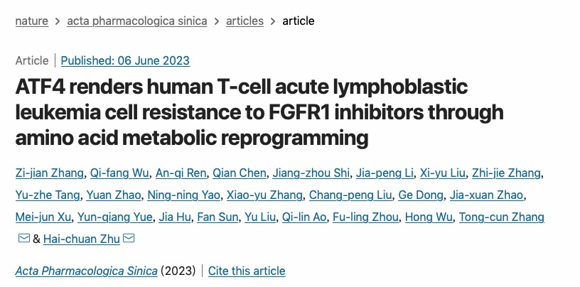 6月9日,365官网张同存教授/祝海川副教授课题组在Acta Pharmacologica Sinica(中科院一区, 药学Top期刊)杂志上,发表题目为“ATF4 renders human T-cell acute lymphoblastic leukemia cell resistance to FGFR1 inhibitors through amino acid metabolic reprogramming”的研究论文。